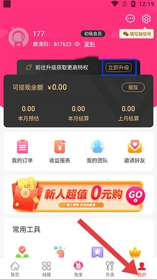 页面顶部清晰展示初级会员身份标识,旁边的“立即升级”按钮醒目引导用户进阶会员等级;可提现余额、订单等关键数据直观呈现;新人专享的超值0元购活动极具吸引力;从首页等其他功能板块跳转至“我的”页面后,这里集中整合了个人核心信息与各类实用工具。