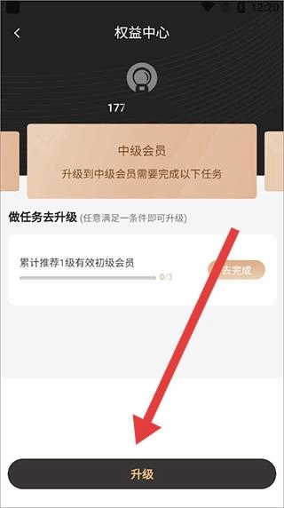 用户当前处于中级会员的升级流程中,页面清晰呈现了升级条件,具体为需累计推荐1名一级有效初级会员,只要满足该任务中的任意一项即可完成升级。