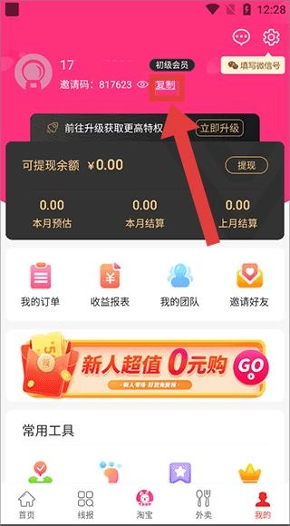 邀请码817623旁边的复制按钮十分醒目,点击就能快速完成复制,方便大家分享邀请;页面上方设有“立即升级”的引导入口,助力提升会员等级;下方则是订单、收益等功能区域。