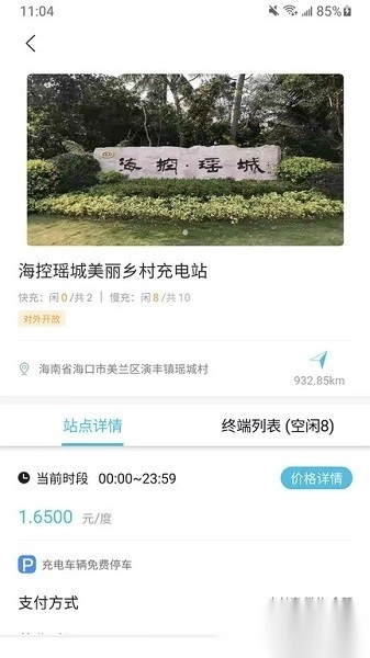 能够查询周边的充电站,页面会清晰展示快充桩和慢充桩的实时数量;