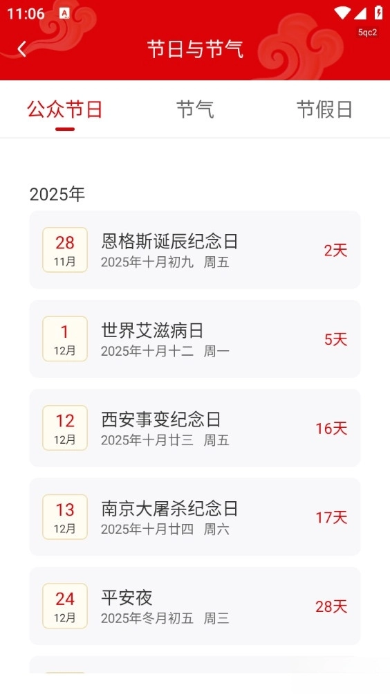 能完整展示每年的各类假日,并且支持新增纪念日设置提醒功能。