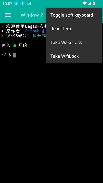 2,进入面具鸭输入m开始安装Magisk,手动选择输入Magisk的共享目录,a.apk是复制Magisk安装包到共享目录里自己重命名的。
