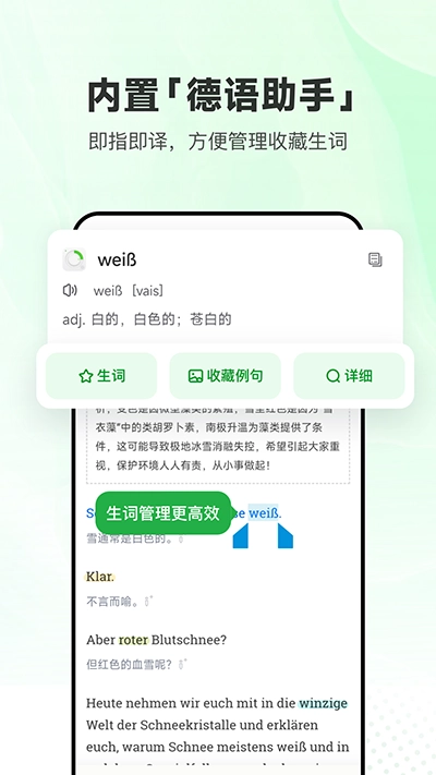 借助“每日一句”的功能,每天掌握一句地道的德语表达,逐步积累常用的词汇与句型。