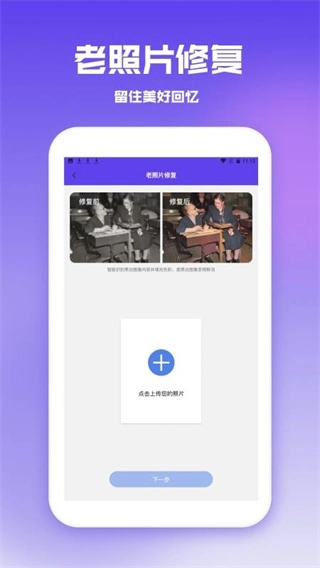 这里为您提供了线上的老照片修复服务,用户只需上传自己的老照片,即可通过一键操作,体验实时的高清修复效果。
