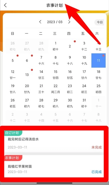 农事计划模块采用日历形式呈现每日任务,允许用户添加自定义计划并标记完成状态,方便进行管理。