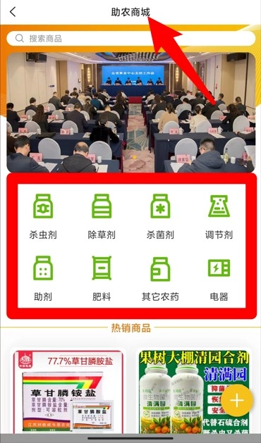 助农商城页面涵盖杀虫剂、除草剂、肥料等各类农资产品,用户可通过搜索功能或分类浏览的方式进行选购。