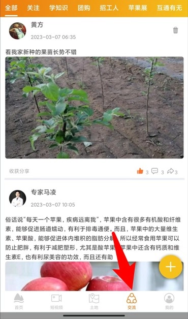 交流社区板块呈现种植心得与农技交流内容,用户能够浏览其他用户的动态,并进行点赞、评论等互动操作。