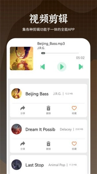 支持对音频等素材开展播放、分享、删除、收藏等管理操作,便于素材的整理与使用。