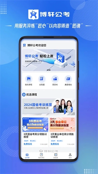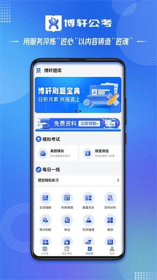 博轩公考具备多种实用学习功能,涵盖公考刷题、公开课报名、学员上课、作业管理、资料领取等板块,用户能够依据自身学习需求,开展针对性的学习与刷题练习。