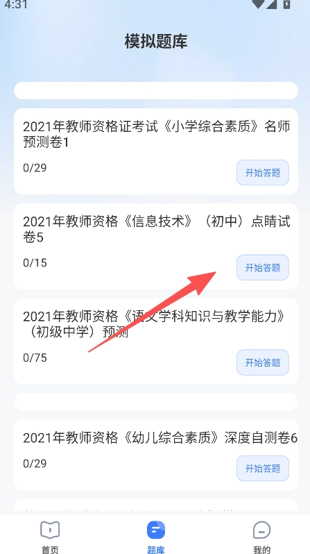 在模拟题库列表里,找到对应科目的试卷并点击开始答题。