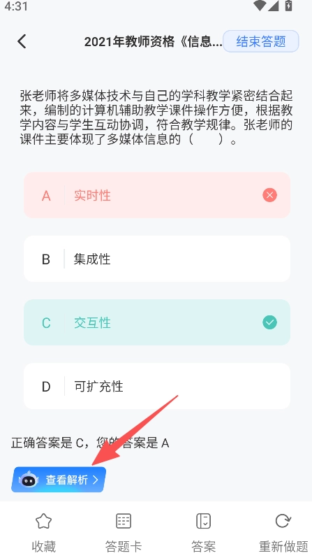 答题之后可以查看对应的解析,这样能清楚知道错题的原因,帮助进一步加深对教资考点的理解和掌握。
