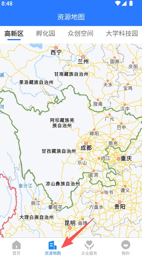 在页面点击资源地图,查看多类别资源的区域分布。