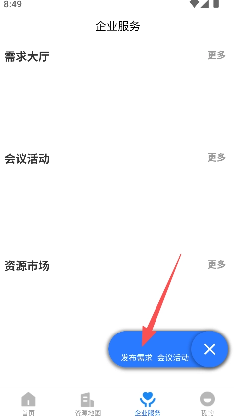 点击企业服务板块,使用发布需求功能推进事务。