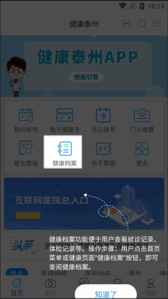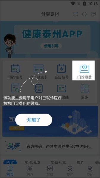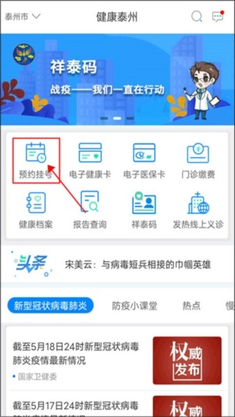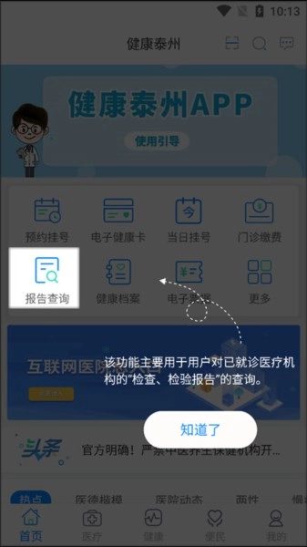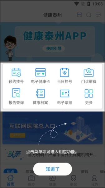 安装好“健康泰州”应用后,打开软件,点击对应的菜单项就能进入相应的功能页面。