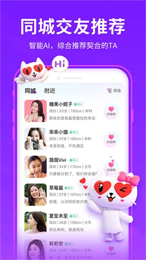 附近陌爱探聊附近陌爱探聊是一款集丰富功能与便捷操作为一体的陌生人社交软件。它凭借多样化的匹配途径以及丰富多元的互动形式,能让用户轻松寻觅到与自身情投意合的有缘之人,进而展开线上交流。不仅如此,严格的用户审核流程以及真人认证体系,充分保障了社交环境的真实性与安全性。对于渴望新鲜感与刺激体验的年轻用户而言,附近陌爱探聊 APP 无疑是一个颇具尝试价值的全新社交选择。