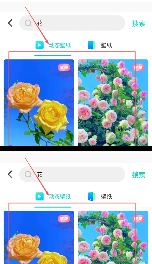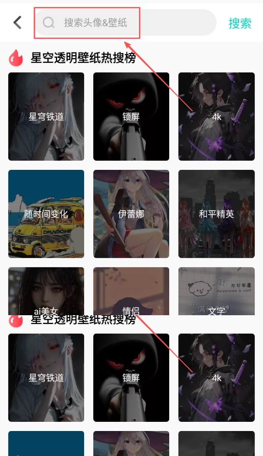 点击顶部的搜索栏,即可进入搜索页面;在该页面输入关键词后,就能查找壁纸资源,并浏览相关的结果列表展示。