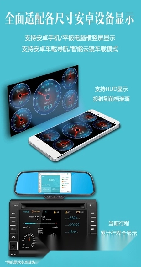 兼容安卓车载导航与智能云镜,支持HUD前挡玻璃投影显示;