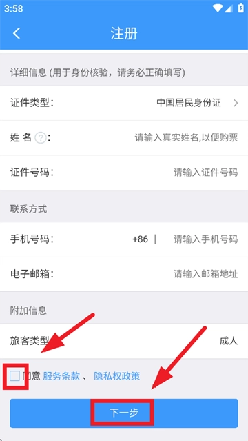 信息填写完毕后,勾选同意服务条款与隐私权政策,接着点击下一步就能完成注册,具体操作可参照图示。