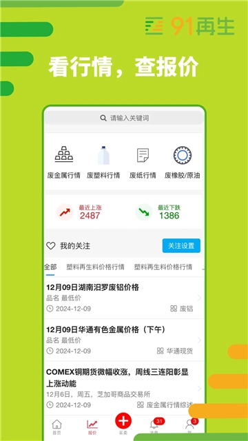 91再生是一款专业可靠的可回收垃圾交易报价软件,涵盖废旧金属、塑料、纸张、橡胶等品类。家里闲置的旧货都能在这里找到买家出售,各类废旧垃圾的价格公开统一,无需四处寻找回收站就能快速处理废品,既省时省力又能赚取收益,感兴趣的小伙伴快来91再生体验吧。