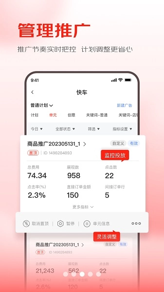 全渠道广告投放:可对快递、购物接触点、京东展位、海外投资计划等主流推广产品进行一站式管理。