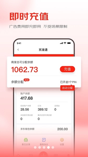 京准通作为一款面向商家的营销推广应用软件,专注于为京东体系内的门店商家提供店铺营销推广相关服务。借助京东集团的数智技术能力,它能够助力商家用户开展各类营销推广活动,进而帮助商家快速实现预期的营销目标。在日常营销场景里,商家可通过京准通制定最优的营销投放方案,依据实际需求对店铺内的单个产品进行投放操作,并能精准把控投放的产品类目。同时,该软件还支持运用智能化的投放策略,为商家店铺打造更均衡的投放效果。