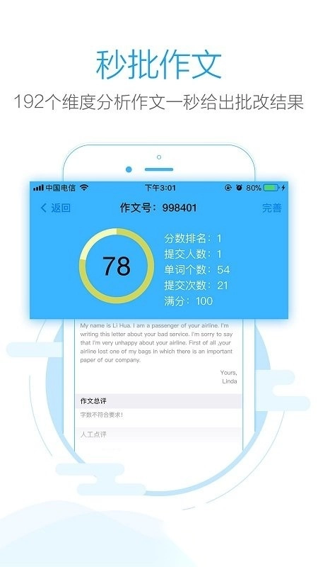这款应用脱胎于批改网平台,把在线自动批改英语作文的功能拓展到了手机端。老师和学生能随时用手机提交作文并得到即时的批改反馈;系统会从多个层面细致评估作文,生成详细的参数报告,让使用者更清楚、更客观地认识到写作里的长处和短板,助力他们进行针对性提升。