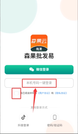 在森果批发易里,点击“同意”提示即可进入登录选择界面。