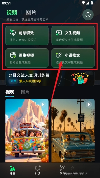 进入软件后,界面上方设有视频和图片板块,用户可根据自身需求选择相应功能。