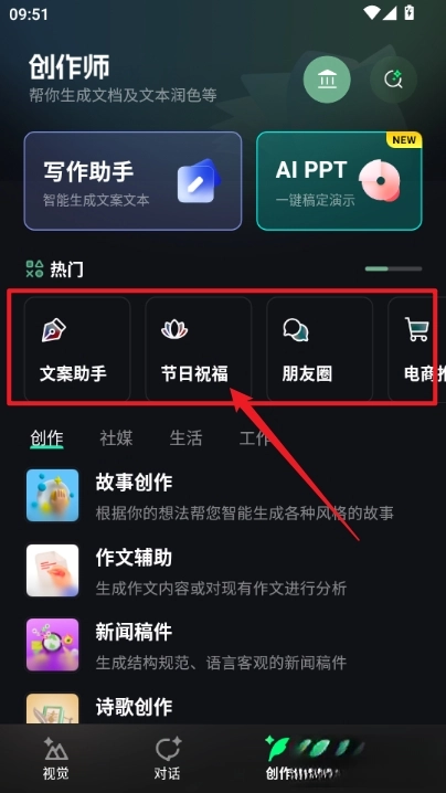 下方创作专区可以通过ai写文案稿件,或者写祝福等