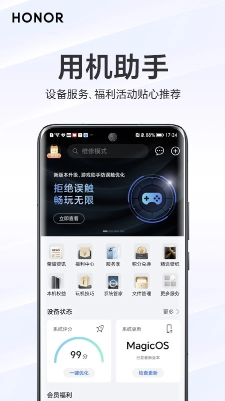 我的荣耀是一款专为荣耀手机打造的工具类应用,整合了荣耀售后、品牌动态、会员福利、产品检测等多元服务,旨在提升用户的用机体验。同时,这款软件界面设计清爽简约,且干扰,操作便捷,能让用户快速上手使用。