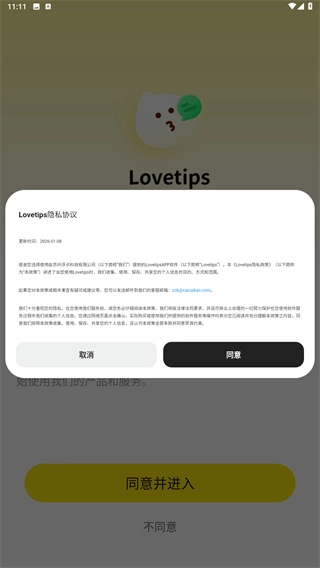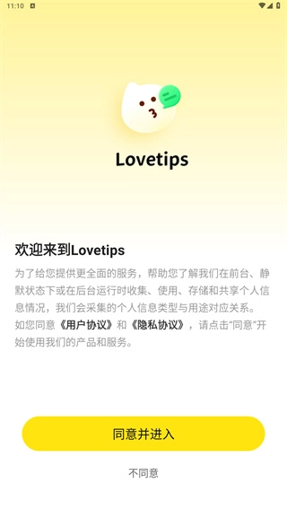 阅读完用户协议与隐私协议后,点击“同意并进入”按钮,即可开启使用流程。