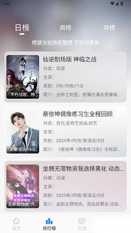 • 覆盖电影、电视剧、综艺、动漫等多元影视品类,适配各年龄层与不同兴趣偏好用户的观看需求。 • 整合全网热门影视资源,实时更新新上映影片及热播剧集,确保用户能随时随地方便快捷地追剧观影。