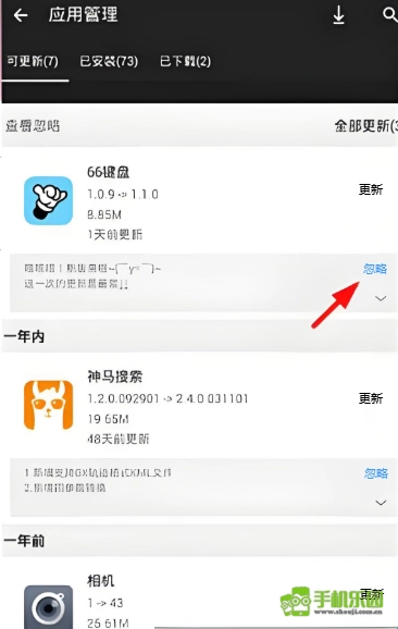 之后挑选你希望忽略的应用,点击右下角的“忽略”按钮,这样后续就不会再收到该软件的更新提醒了。