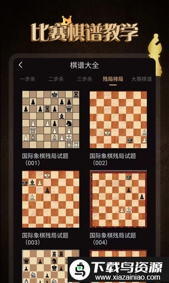 整合了五千多个残局棋谱,涵盖马头书、波加尔一步杀、两步杀以及三步杀等多种残局类型。