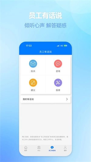 员工有话说;可以随时跟领导投诉、咨询、建议、报修