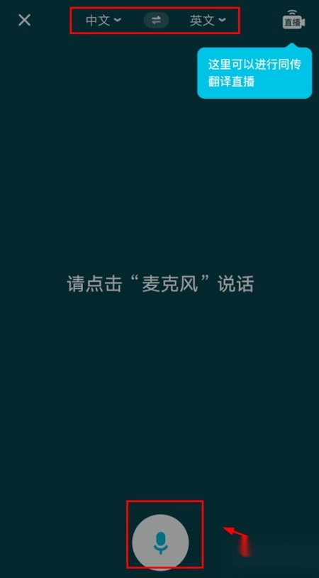 在【同传翻译】页面,您可以自主选择需要翻译的语言,选好之后,打开麦克风就能使用了。