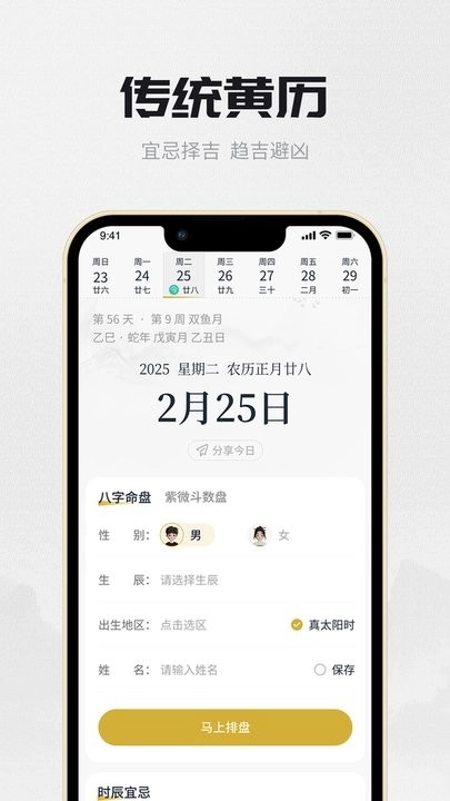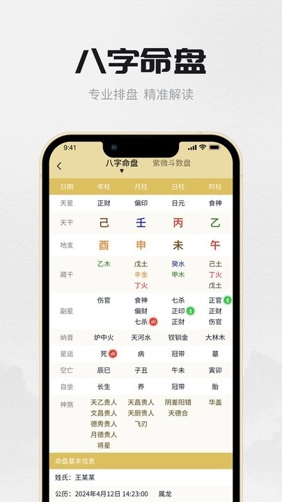 精准排盘功能可一键生成八字命盘与紫微斗数盘,并提供大运、流年、流月、流日、流时等多维度的命理分析。