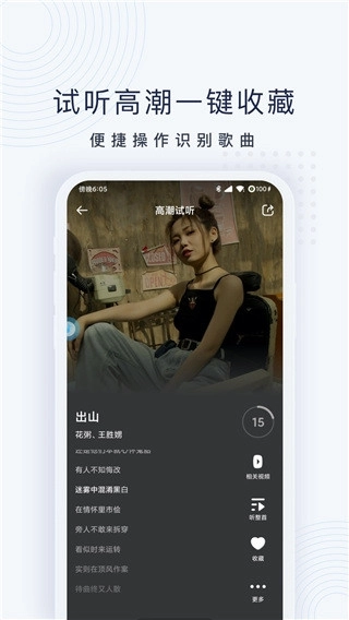 【高潮试听】识别结果支持试听歌曲高潮部分,还能直接跳转到你常用的音乐播放器听完整曲目,绝对是找歌时的必备工具。