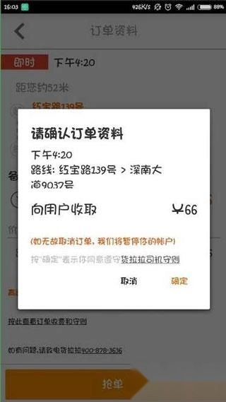 抢单成功后,系统会提示再次确认订单信息,此时我们点击确定即可。