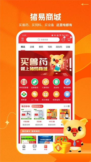 购买商品:这里有兽药、饲料、添加剂可供选购,各类猪场设备也一应俱全,另外还能了解养猪补贴相关信息。