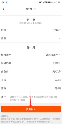 先选好必填的区域,接着挑选需要报价的猪,点击“我要报价”按钮,你的报价就会发布出去,猪肉厂的厂商就能看到你的报价,并且会根据自身需求来购买你的猪了。