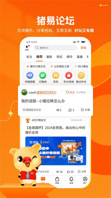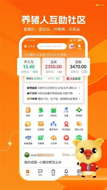 逛论坛:这是一个开放互动的养猪行业交流平台,养殖户可以在这里分享养殖技术经验,探讨和学习养殖知识,了解最新的猪市行情走势,诉说养殖过程中遇到的难题,发表自己的感言,还能对行业内的是非进行评论。