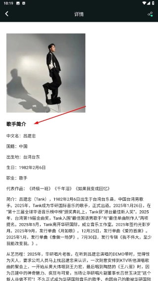 进入歌手详情页后,能查看歌手完整的基础信息、从业经历和代表作品,从而深入了解其创作故事。