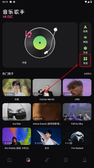 进入音乐编辑界面后,点击下方的切换按钮,即可进入音乐歌手界面浏览海量歌手内容。