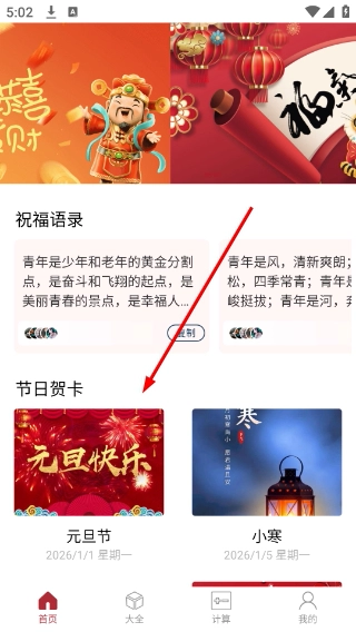 在祝福类应用的首页,找到并点击【元旦节】对应的节日贺卡样式,即可进入该贺卡的编辑设计界面。