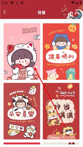 在背景选择页面,选择招财猫图案的背景样式,并将其应用于元旦贺卡的设计。