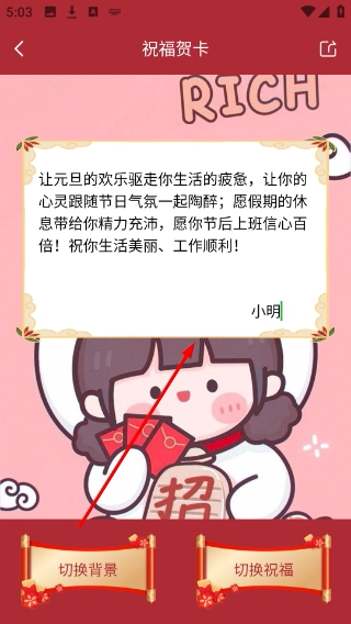 在贺卡的署名区域,完成元旦贺卡署名的个性化编辑工作。