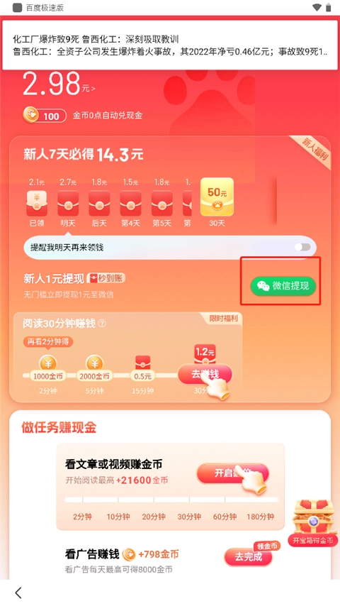 百度极速版赚钱版是一款人气超高的百度版本,它体积小巧,界面简洁清爽,没有繁杂功能,最关键的是能赚钱。我每天在上面看新闻、刷视频、完成任务、签到等,都能获取金币并提现,既能娱乐又能赚钱,感兴趣的朋友们快来试试吧。