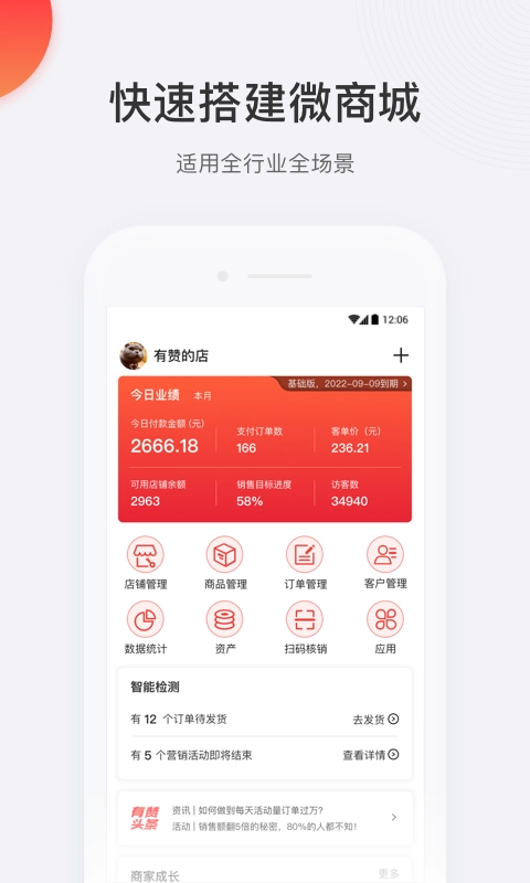 有赞微商城是一款商店管理服务软件。如果你想创业、开网店或是做些副业,又不想投入太多资金,不妨试试有赞微商城——它能帮你更高效地管理和运营自己的店铺。促销、广告和供应链的问题都无需你操心,有专业团队为你提供这些服务。你只需要注册账号,在有赞微商城上开设店铺,就能轻松管理自己的生意了。