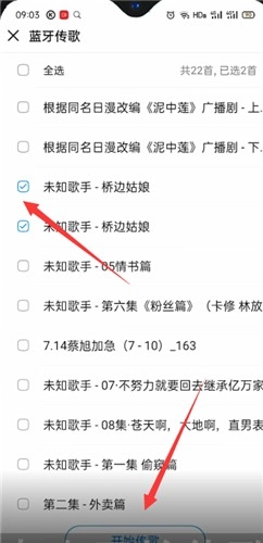 勾选需要传输的歌曲,点击“开始传歌”按钮,选择目标发送设备,待对方确认接收后,即可完成传输。